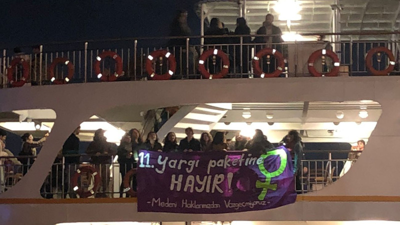 Kadınlar, "11. Yargı Paketine hayır" yazılı pankartı vapurdan sallandırmış, ardından Beşiktaş'ta yürüyerek "Kadın cinayetleri politiktir" ve "Devlet elini bedenimden çek" sloganları atmıştı.
