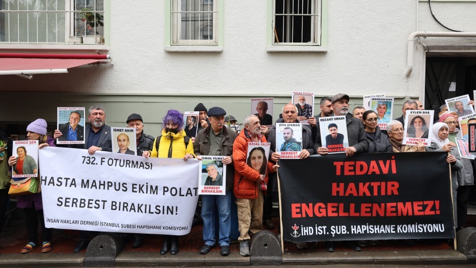 İHD İstanbul Şubesi Hapishane Komisyonu, Beyoğlu'nda bulunan dernek binalarının önünde "F Oturması" eyleminin 732'ncisi gerçekleştirildi. Eylemde, "Tedavi haktır engellenemez", "Ekim Polat serbest bırakılsın" pankartları açıldı. Bu haftaki eylemde, Burdur Yüksek Güvenlikli Hapishanesi'ndeki hasta tutsak Ekim Polat'ın durumuna dikkat çekildi. Eylemde sık sık "Hasta mahpuslar serbest bırakılsın" ve "Tedavi haktır engellenemez" sloganları atıldı.