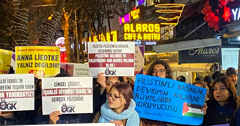 Ankara Kadın Platformu, siyonist İsrail hapishanelerinde uğradığı tecavüz işkencesini teşhir eden Zora temsilcisi gazeteci Anna Liedtke ile dayanışmak için sokağa çıktı. Yüksel Caddesinde, "İşgalci İsrail'in hapishanelerinde cinsel saldırıyla mücadele eden kadınların yanında, sokaktayız" pankartı açan kadınlar, işgal ordusunun katlettiği Ayşenur Ezgi'nin fotoğrafının yer aldığı "Ayşenur yolumuzu aydınlatıyor" ile "Yaşasın enternasyonal kadın dayanışması", "Anna Liedtke yalnız değildir", "Filistinli kadınları devrimin kalkanı, rüyaların koruyucusu", "İşgalci İsrail'in şiddetini teşhir eden Anna'nın yanındayız", "Cinsel şiddet, işgalci siyonist İsrail'in gerçek yüzüdür", "Filistin Filistinlilerindir, bedenimiz bizim", "Filistinli kadınlardan Anna Liedtke'ye baskıya, şiddete, istismara geçit yok" dövizlerini taşıdı.