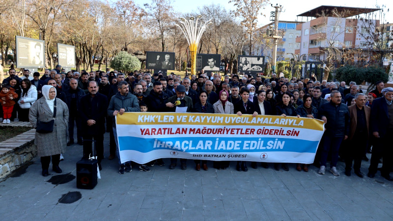 KHK ve kayyum uygulamalarına karşı açıklama yapan İHD Batman Şubesi, "Bir yandan Kürt sorununun çözümüne dair girişimlerde bulunulurken, diğer yandan aynı gerekçelerle ihraç edilen kamu emekçilerinin görmezden gelinmesi; kayyum uygulamalarının sürdürülmesi ve belediye emekçilerinin özlük haklarıyla birlikte görevlerine iade edilmemesi yürütülen sürece olan güveni ve umudu zedeleyecektir" dedi.