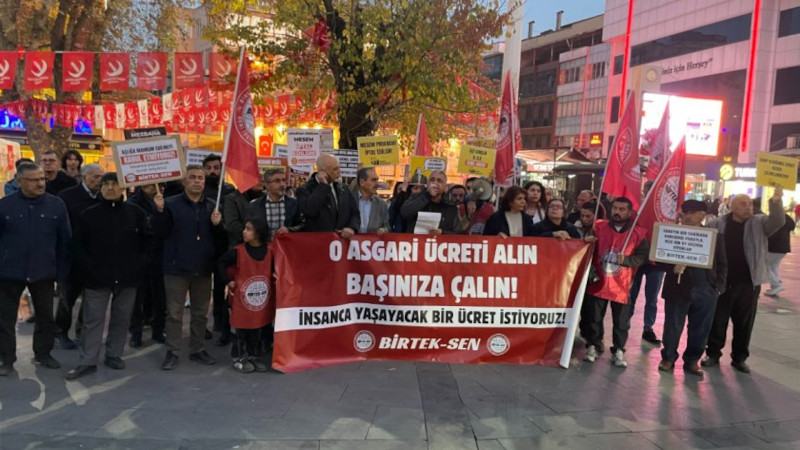 Asgari ücretin 28 bin 75 TL olarak belirlenmesine tepki gösteren BİRTEK-SEN üyeleri, açlık sınırı altındaki asgari ücreti kabul etmediklerini vurguladı, "açlığa ve sefalet ücretine karşı birleşme" çağrısı yaptı.