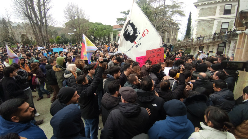 Boğaziçi Üniversitesi öğrencileri, kayyum rektör Naci İnci'nin kararıyla Hamlin Hall'deki öğrenci kulüplerinin odalarını boşaltma kararına karşı, Güney Meydan'da bir araya geldi.