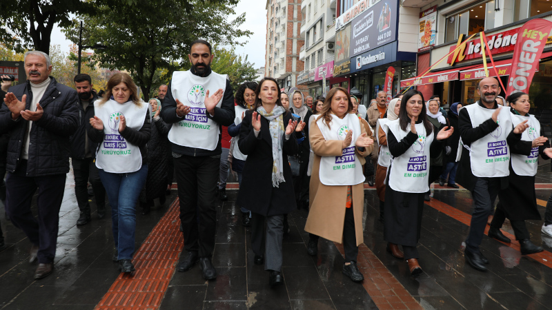 Batman'daki yürüyüş için Yılmaz Güney Parkında toplanan kitleye seslenen DEM Parti Eş Genel Başkanı Hatimoğulları, ekmek ve barış için bütçe talebini meydanlarda, parlamentoda yürütülen bütçe görüşmelerinde şiar edindiklerini söyledi. Komisyon çalışmalarında bu talebi içeren bir bütçenin hazırlanması için 40 güne yakın çalışma yaptıklarını aktaran Hatimoğulları, verdikleri bütün önergelerin AKP ve MHP'nin oylarıyla reddedildiğini hatırlattı. İşçinin ve emekçinin hakkını savunduğunu iddia eden iktidarın bütçeyi faiz lobilerine, sermaye gruplarına, yandaş şirketlere ayırdığını vurgulayan Hatimoğulları, "En önemlisi de barışı konuştuğumuz bu günlerde bütçeyi yine silaha ve özel harp politikalarına ayırmak üzere bir planlama içinde olduklarını gördük" dedi.
