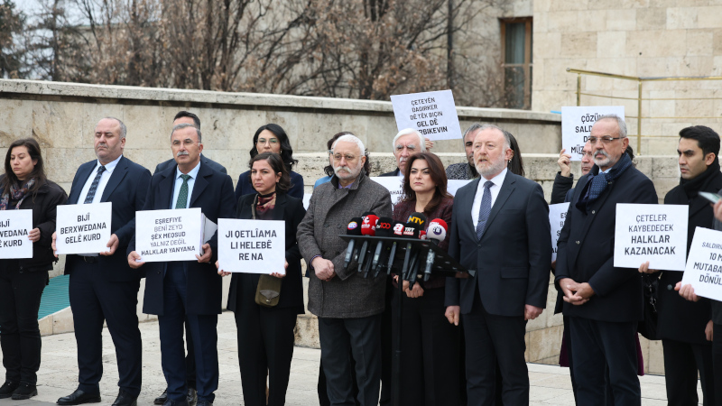 Halkların Eşitlik ve Demokrasi Partisi (DEM Parti) Meclis Grubu, Suriye'de cihatçı Heyet Tahrir Şam (HTŞ) yönetiminin Halep'teki Kürt ve Süryani mahalleleri Şêxmeqsûd, Eşrefiyê ve Benî Zeyd'deki saldırılarına karşı mecliste basın toplantısı düzenledi.