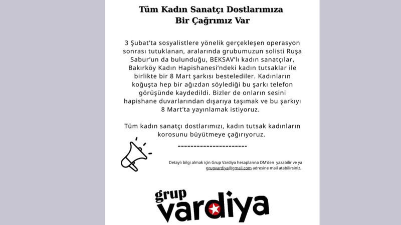 Grup Vardiya'nın çağrısı şöyle: 3 Şubat'ta sosyalistlere yönelik gerçekleşen operasyon sonrası tutuklanan, aralarında grubumuzun solisti Ruşa Sabur'un da bulunduğu, BEKSAV'lı kadın sanatçılar ile birlikte Bakırköy Kadın Hapishanesi'ndeki kadın tutsaklar bir 8 Mart şarkısı bestelediler.