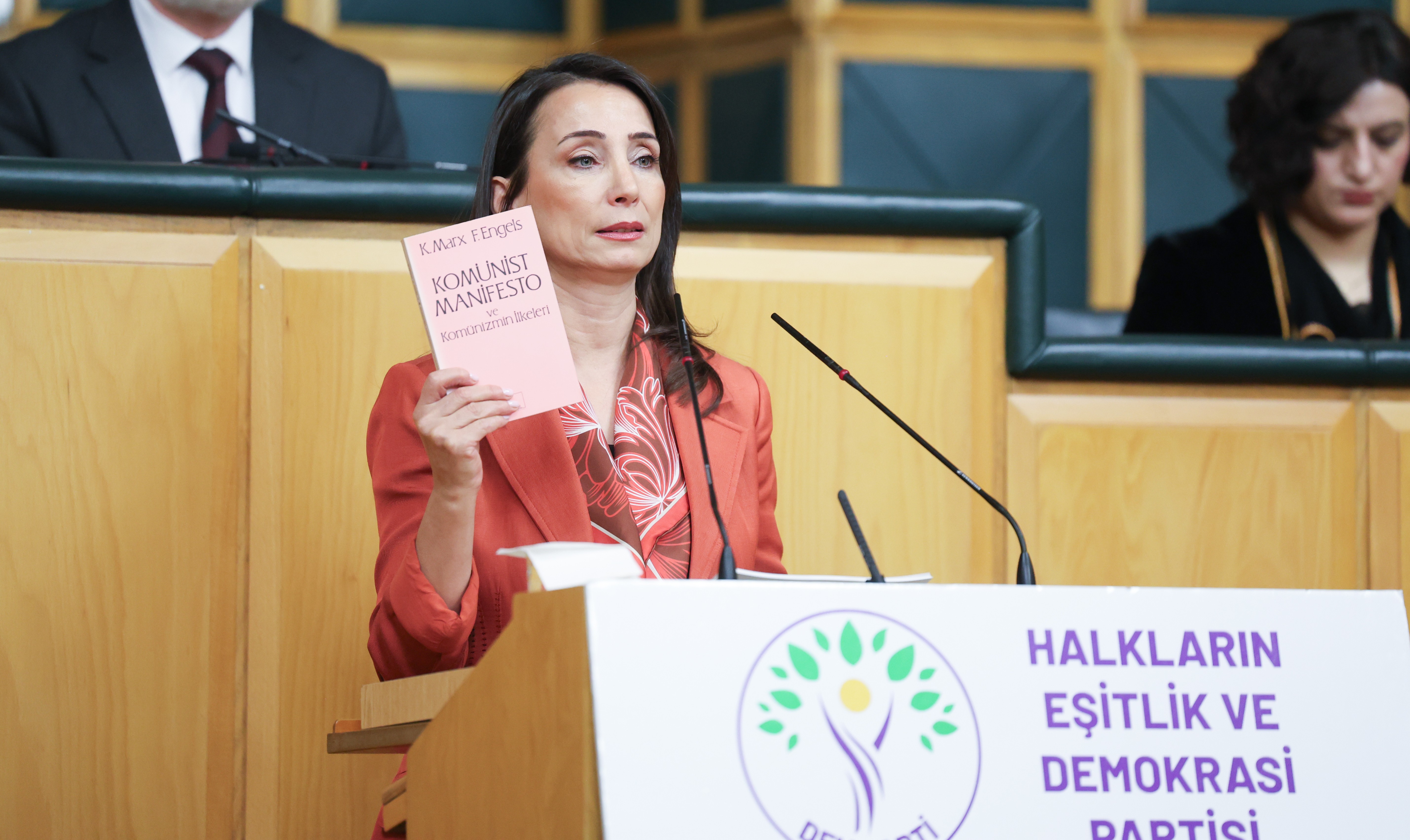 77 sosyalistin tutuklanmasına ve yargılandıkları dosyaya delil olarak Komünist Manifesto’nun konulmasına tepki gösteren DEM Parti Eş Genel Başkanı Tülay Hatimoğulları, kitabı grup toplantısında kürsüden gösterdi, “Bunu suç sayanlara öneriyoruz. Bu kitabı alın, hakkıyla okuyun” dedi.