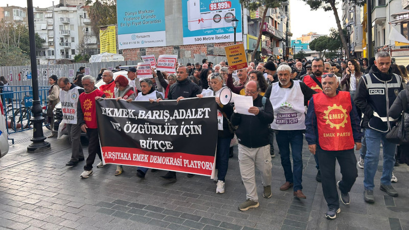 Karşıyaka Emek ve Demokrasi Platformu, 2026 bütçe talepleri için İzban önünde toplanarak, Karşıyaka İskelesine yürüdü. "Ekmek, barış, adalet ve özgürlük için bütçe" pankartı açılan eylemde, "Asgari değil insanca bir yaşam", "İnsanca yaşam, halk için bütçe" dövizleri taşındı. Eylem boyunca, "Sermayeye değil halklara bütçe", "Savaşa değil barış için bütçe" sloganları atıldı. Eyleme, Halkların Eşitlik ve Demokrasi Partisi (DEM Parti) İzmir Milletvekili İbrahim Akın'ın yanı sıra çok sayıda siyasi parti ve demokratik kitle örgütü temsilcisi katıldı.