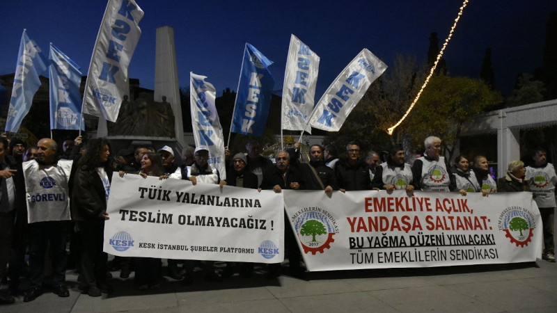 Kamu Emekçileri Sendikaları Konfederasyonu (KESK) İstanbul Şubeler Platformu, TÜİK'in sahte enflasyon verilerini Bakırköy Özgürlük Meydanında protesto etti. "TÜİK yalanlarına teslim olmayacağız" ve "Emekliye açlık, yandaşa saltanat: Bu yağma düzeni yıkılacak" pankartları açılan eylemde, "TÜİK elini ekmeğimden çek", "Sefalete teslim olmayacağız", "Birleşe birleşe kazanacağız" sloganları atıldı.