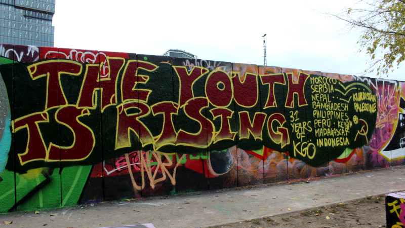Berlin'de duvar yazılamasıyla 31. yılını kutlayan KGÖ, tüm kıtalarda direnen gençleri andı.