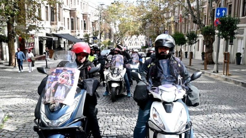 Motorlarıyla Beşiktaş'tan Beyoğlu'nda bulunan Hacıahmet Parkına kadar konvoy olan motokuryeler, Rojin Kabaiş'in fotoğraflarının yer aldığı "Rojin için adalet" dövizleri dövizi taşıdı.