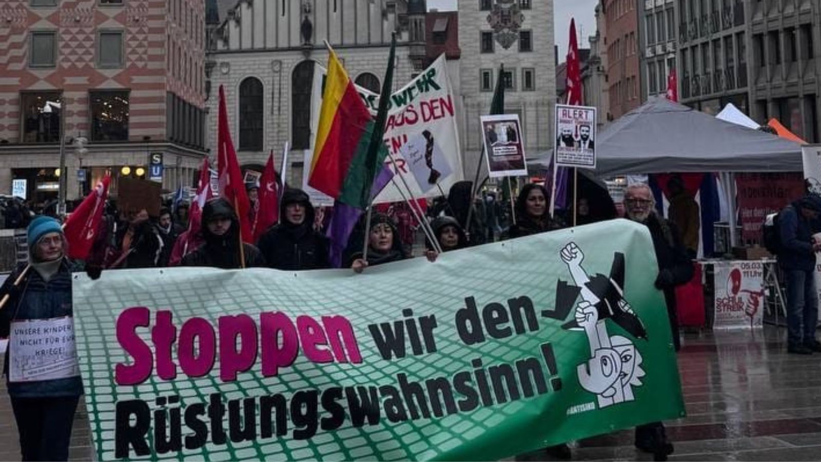 Karlsplatz'da başlayan yürüyüş Marienplatzt'da yapılan mitingin ardından sona erdi. Yapılan konuşmalarda Almanya Savunma Bakanı Sabine Pistorius'ın savaş çığırtkanlığı yaptığı belirtildi, "Almanya, Rusya'ya karşı savaşa hazırlanıyor" denildi.