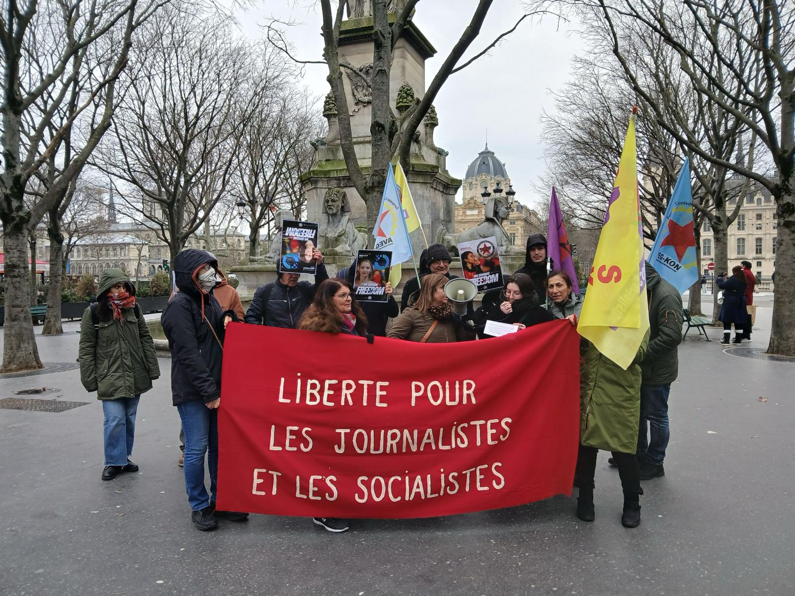 Chetalat Meydanı'nda yapılan eylemde Fransızca "Gazetecilere ve Sosyalistlere Özgürlük" pankartı açıldı. Fransızca yapılan açıklamada sosyalistlere yönelik tutuklama saldırısında 81 sosyalistin tutsak edildiği, politik İslamcı faşist saray rejiminin kadın örgütlerini, söz, eylem ve örgütlenme özgürlüğünü hedef aldığı belirtildi. Bu saldırıları boşa düşürmek için kadın dayanışmasının büyütülmesi çağrısı yapıldı.