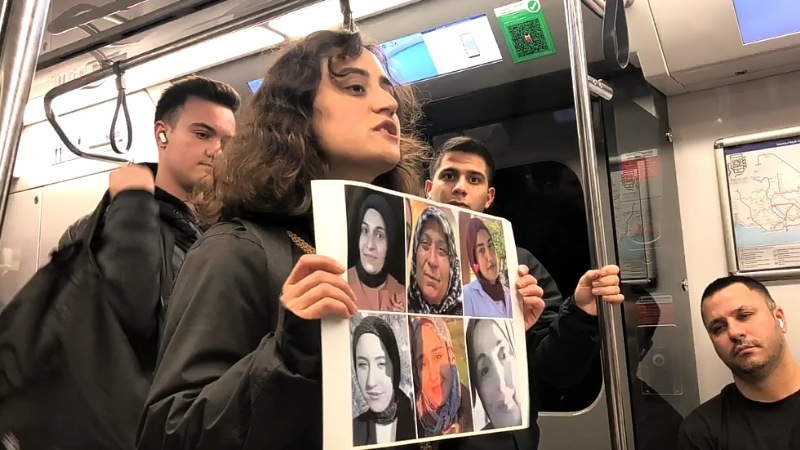 Dilovası'nd katledilen kadın ve çocuk işçilerin fotoğrafıyla metroda kadinlara seslenen SKM'liler, yaşanan işçi katliamını hatırlattı, "Bu ülkede hergün kadınlar evlerinde, iş yerinde katlediliyor" dedi.