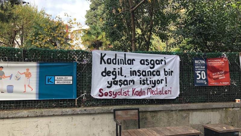 Kadın işçi ve emekçilerin taleplerini dillendiren SKM, "Kadınlar asgari değil, insanca yaşam istiyor" pankartını Kadıköy'ün en işlek noktalarından biri olan Söğütlüçeşme'ye astı.