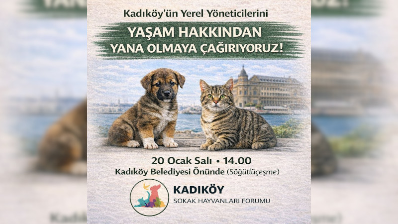 "Bizler sokaklarımızı, mahallelerimizi paylaştığımız hayvan dostlarımızın haklarını sonuna kadar savunmaya kararlıyız. İlçe yerel yöneticilerimizin de nefretle ölüm isteyenlerin değil, yaşamdan yana olan bizlerin ve yaşamlarından, yaşam alanlarından koparılmak istenen hayvanların yanında olmasını bekliyoruz. Çünkü bir yasa can alıyorsa, yaşam hakkını gasp ediyorsa kabul edilemez. Çünkü vicdan yasalardan üstündür. Çünkü katliam yasasının karşısında kararlılıkla hukuk ve adalet mücadelesi verirsek biz kazanırız, hayvanlarımızı yaşatırız" diyen Kadıköy Sokak Hayvanları Forumu, 20 Ocak Salı günü, saat 14.00'da Kadıköy Belediyesi önüne çağırıyor.