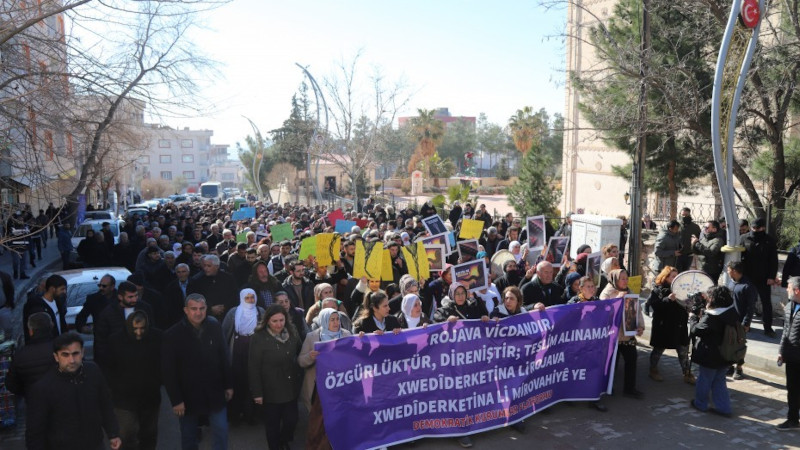 Mardin'in Derik ilçesinde Demokratik Kurumlar Platformu tarafından yürüyüş gerçekleştirildi. PTT binası önünde toplanan binlerce kişi, yürüyüş öncesi sloganlar atarken, kadınlar birbirlerinin saçlarını örerek, katledilen YPJ'li bir savaşçının saçlarının kesilmesine tepki gösterdi. Kitle ellerinde "Jin, jiyan, azadî" ve "Xwedîderketina li Rojava xwedîderketina li mirovahîyê ye" pankartlarının yanı sıra YPJ savaşçılarını simgeleyen saç örgülerinin yer aldığı dövizler taşıdı.