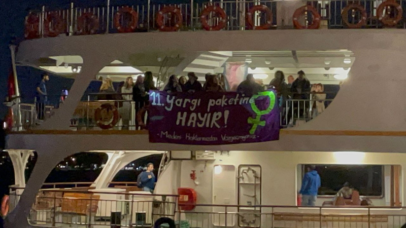 Kadıköy-Beşiktaş vapurunda "11.Yargı Paketine hayır" pankartı açan kadınlar, "Nefrete inat yaşasın hayat", "Susmuyoruz korkmuyoruz itaat etmiyoruz" sloganlarını attı.