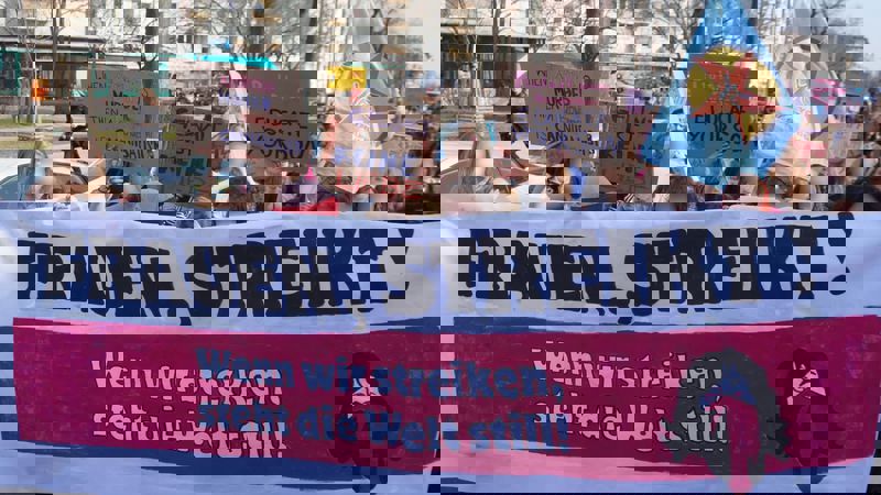 Almanya'da 8 Mart kadın grevi, dün yapıldı. Siyasi grevin yasak olduğu ülkede kadınlar, erkek şiddeti ve emek sömürüsünün Alman devletinin savaş hazırlıklarını, artan ırkçılık ve polis şiddetini de protesto etti.