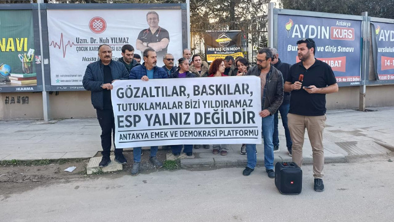 Antakya Emek ve Demokrasi Platformu, Ezilenlerin Sosyalist Partisi'ne (ESP) ve sosyalist kurumlara yönelik siyasi kırım operasyonunda 78 sosyalistin tutuklanmasına dair basın açıklaması gerçekleştirdi. "Gözaltılar, tutuklamalar, baskılar bizi yıldıramaz. ESP yalnız değildir" pankartının açıldığı eylemde "Devrimci tutsaklar onurumuzdur" sloganı atıldı.