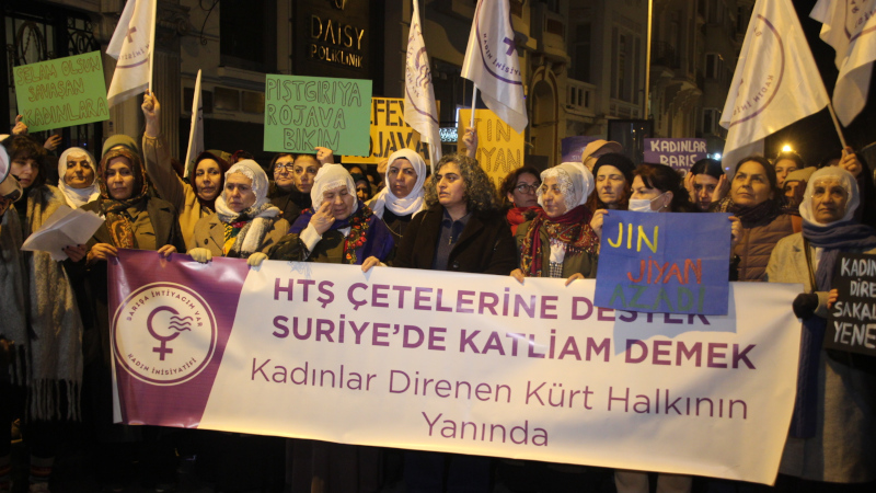 Barışa İhtiyacım Var Kadın İnisiyatifi'nin çağrısıyla çok sayıda kadın Suriye Konsolosluğu önünde yan yana geldi. "HTŞ çetelerine destek Suriye'de katliam demek. Kadınlar direnen Kürt halkının yanında" pankartı açılan eylemde "Jin jiyan azadi", " Rojava'da düşene dövüşene bin selam", "Yaşasın kadın dayanışması" sloganları atıldı.