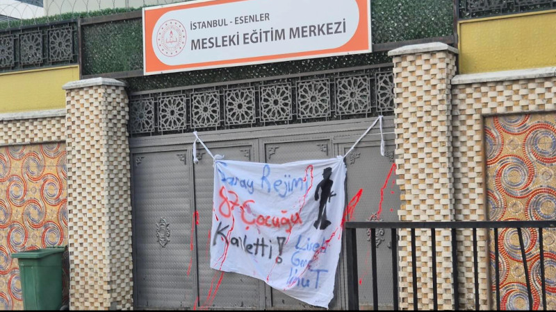 Liseli Genç Umut'tan iki lise öğrencisi, Esenler Mesleki Eğitim Merkezi'nin kapısına "Saray rejimi 87 çocuğu katletti" yazılı pankart astı.