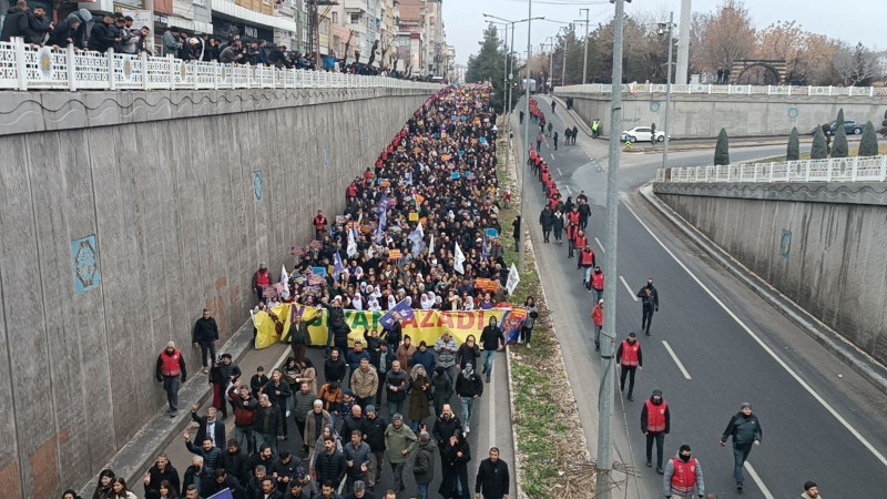 Diyarbakır'da 1 Şubat Dünya Rojava ile Dayanışma Gününde onbinler saldırıların sona ermesi için yürüdü. Demokratik Kurumlar Platformu öncülüğünde "Rojava direniştir, özgürlüktür" şiarıyla gerçekleştirilen yürüyüş Koşuyolu Parkı İnsan Hakları Anıtı önünden Ofis AZC Plaza önüne kadar sürdü.