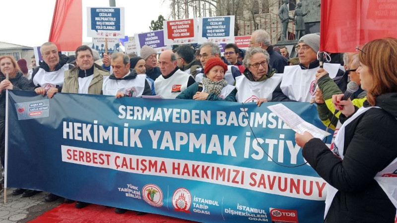 Hekimler mesleki bağımsızlık ve serbest çalışma hakkı için yaptıkları eylemde, "Hukuki, mesleki ve örgütsel mücadelemizi sürdüreceğimizi ilan ediyoruz. Daha iyi sağlık hizmeti verebilmemiz için haklı taleplerimiz dikkate alınmalıdır" dedi.