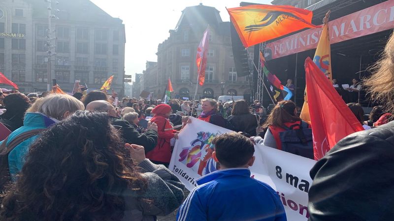 "Feminist Kadın Yürüyüşü"nün Dam Meydanı'nda kurduğu kürsüde İran, Afgan ve Kürt kadınları ile FNV sendikasından kadınlar konuşma yaptı. Yapılan konuşmalarda; emperyalist savaş, şiddet, kadın cinayetleri, yoksulluk ve hükümetin ekonomik politikaları ile emperyalist savaşa verdiği destek ve kadın haklarının kırpılmasına karşı tepkiler öne çıktı.
