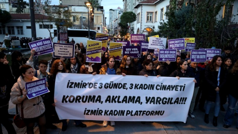 İzmir Kadın Platformu, artan kadın katliamlarına karşı Alsancak ÖSYM binası önünde bir araya gelerek, Türkan Saylan Kültür Merkezi önüne doğru yürüdü. "İzmir'de 3 günde, 3 kadın cinayeti. Koruma, aklama, yargıla" pankartı yer aldığı yürüyüşte "Kutsal aileniz batsın kadınlar yaşasın" ve "Bilip susanlar suçludur, sorumludur" dövizleri taşındı. Sık sık "Jin, jiyan, azadî", "Kadın yaşam özgürlük", "Kadın cinayetleri politiktir" ve "Bijî berxwedana jinan" sloganları atıldı. Çok sayıda kadının katıldığı açıklamayı Platform üyesi Rabia Taşdemir yaptı.