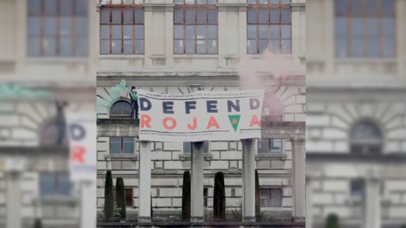 Enternasyonalist Counter-Attaque grubu, Lozan Antlaşması'nın imzalandığı Rumine Sarayı'ndan "Rojava'yı Savun" pankartı sallandırdı.