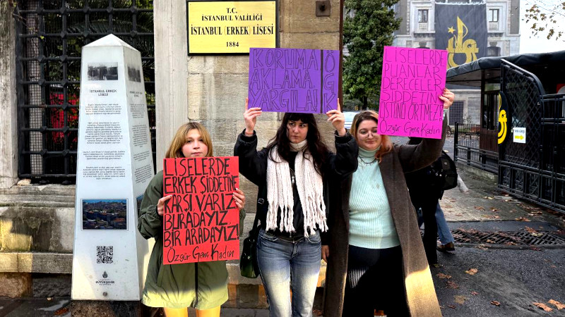 Özgür Genç Kadın (ÖGK), İstanbul Erkek Lisesinde kadın öğrencilere yönelik tacize ilişkin lise önünde eylem yaptı. "Liselerde puanlar, dereceler şiddetin üstünüz örtemez", "Koruma, aklama, yargıla" dövizlerini açan genç kadınlar, erkek şiddetine karşı mücadele edeceklerinin altını çizdi.