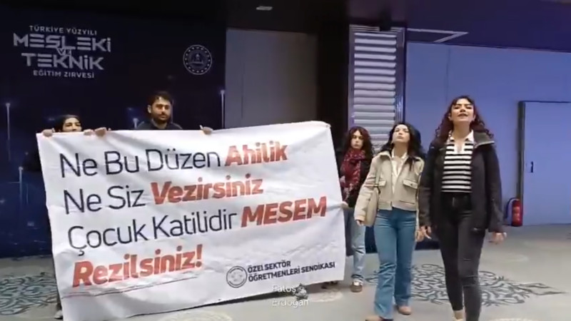 Özel Sektör Öğretmenleri Sendikası, İstanbul'da düzenlenen Mesleki ve Teknik Eğitim Zirvesi'ni bastı, sadece 2025 yılında 85 çocuk işçinin katledildiğine dikkat çekerek, "MESEM'ler kapatılsın, çocuk işçilik yasaklansın" dedi. Öğretmenler ters kelepçeyle gözaltına alındı.