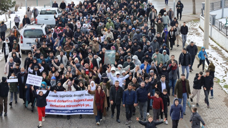 Kuzey ve Doğu Suriye'ye dönük saldırılara Silopi ilçesinde Şırnak Demokratik Kurumlar Platformu öncülüğünde yürüyüş düzenlendi. Yürüyüş için siyasi parti ve demokratik kitle örgütü temsilcileri İpekyolu Caddesi üzerinde yer alan 1'nci Cadde kavşağında bir araya geldi. Yürüyüşe saatler kala bir araya gelen kitle "Bijî berxwedana Rojava", "Rojava DAÎŞ'e mezar olacak" sloganları attı. Kitle "Savaşa dur de", "Rojava rûmeta me yê", "Bijî berxwedana gelê kurd" dövizleriyle "Şoreşa Rojava bû tirs û xofa dilê neyar û hovan" pankartı taşıdı. Binlerin katıldığı yürüyüşte sık sık "Bijî berxwedana Rojava", "Rojava DAİŞ'e mezar olacak", "Bijî berxwedana QSD" ve "Rojava rûmeta rûmeta gelê Kurd e" sloganları atıldı.