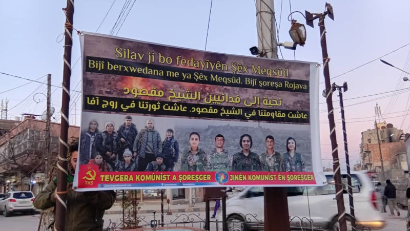 Rojavalı komünistler, Qamişlo kent merkezinde bulunan Soni kavşağına ve Kültür ve Sanat kurumunun yanına "Selam olsun Şêxmeqsûd fedailerine" ve "Yaşasın Şêxmeqsûd direnişimiz, yaşasın Rojava devrimi" yazılı pankartlar astı.