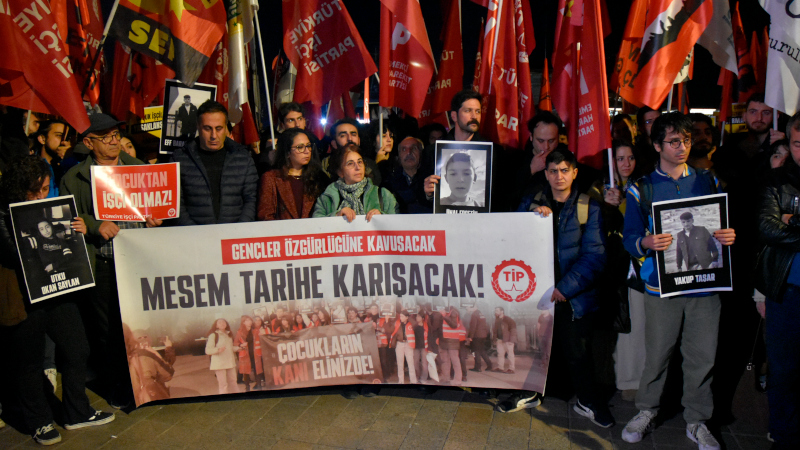 İzmir Emek ve Demokrasi Güçleri, Alsancak Gar önünden sloganlarla Türkan Saylan Kültür Merkezi önüne yürüdü. "MESEM tarihe karışacak, gençler özgürlüğe kavuşacak" pankartı açılan eylemde, "Patronların bakanı Yusuf Tekin istifa" ve "Çocukların katili saray rejimi" sloganları atıldı.