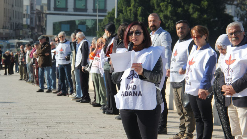 Açıklamayı okuyan İHD Adana Şube Başkanı Yasemin Dora Şeker, İnsan Hakları Evrensel Bildirgesi'nin kabul edilişinin 77. yılında olduklarını hatırlattı, "Özellikle devletlerin demokrasi ve hukuk taahhüdünden giderek uzaklaşmaları, başta Evrensel Bildirge olmak üzere uluslararası insan hakları sözleşmelerinden doğan yükümlülüklerini yerine getirmekten kaçınmaları, insanlığın en önemli kazanımlarından birisi olan insan haklarının hem bir referans sistemi hem de bir denetim mekanizması olarak zayıflamasına, küresel insan hakları rejiminin ağır bir kriz içine girmesine yol açmıştır" dedi.