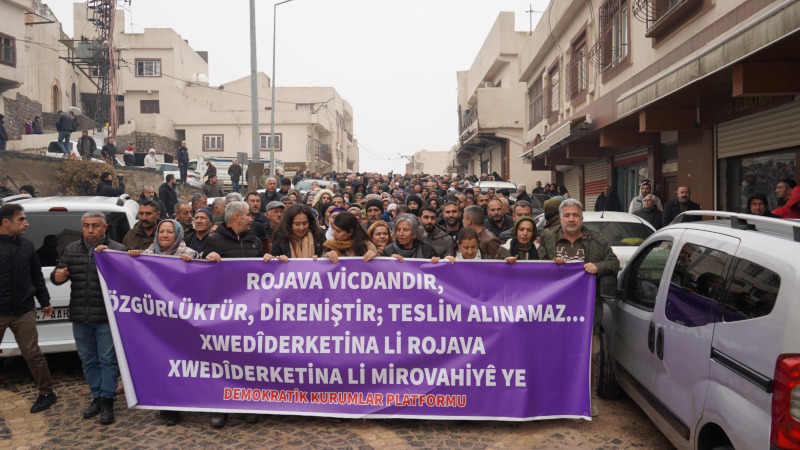 Mardin'in Derik ilçesinde Demokratik Kurumlar Platformu tarafından,yürüyüş gerçekleştirildi. "Xwedî derketina Rojava Xwedî derketina mirovahiyê ye/Rojava direniştir, özgürlüktür, teslim alınamaz" pankartının açıldığı yürüyüşe yüzlerce kişi katıldı.