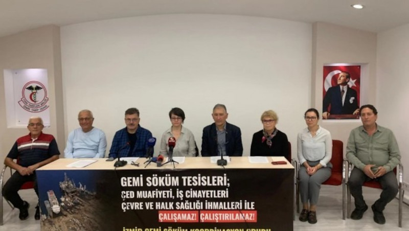 İzmir Gemi Söküm Koordinasyonu, Aliağa'da bulunan gemi söküm tesislerinin kapasite artışına ilişkin İzmir Tabip Odası'nda basın toplantısı yaptı.