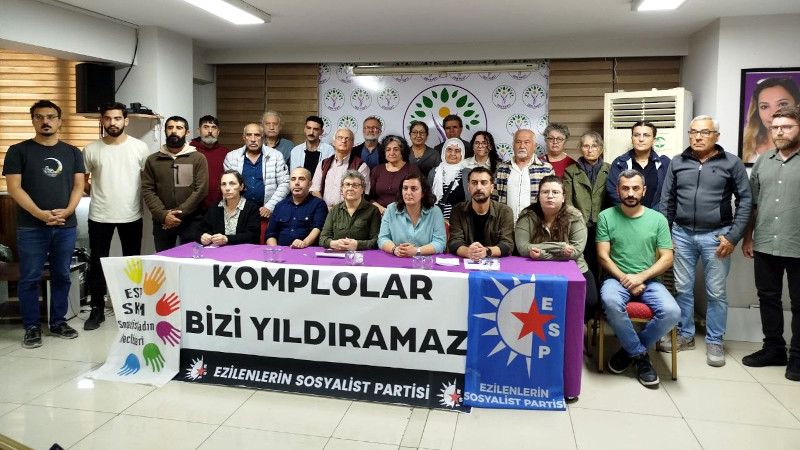 Ezilenlerin Sosyalist Partisi (ESP) Eş Genel Başkanı Deniz Aktaş ve SKM Genel Meclis üyesi ve ajansımızın muhabiri Ebru Yiğit'e verilen hapis cezalarına ilişkin Halkların Eşitlik ve Demokrasi Partisi (DEM Parti) İzmir İl Binasında basın toplantısı düzenlendi.
