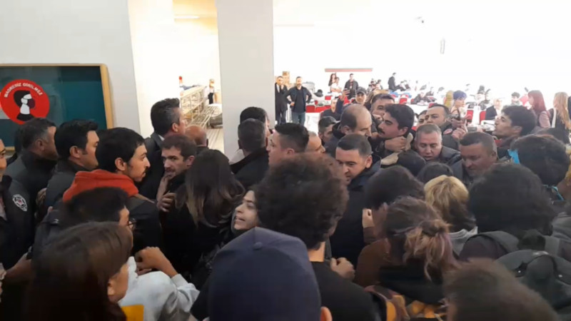 Ardından öğrenciler, "Şirketlere, özel güvenliğe, kayyum rektöre üniversitemizi teslim etmeyeceğiz" diyerek turnikelerden atladı, yemekleri kendileri dağıttı. Eylemi engellemeye çalışan özel güvenlik birimleri (ÖGB) ise öğrenciler tarafından dışarı çıkartıldı.