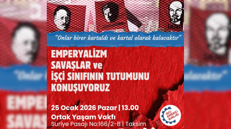 İşçi Emekçi Birliği, "Emperyalizm, savaşlar ve işçi sınıfının tutumu"nu başlıklı forum düzenliyor. 25 Ocak Pazar günü gerçekleştirilecek forumda, emperyalist savaş hazırlığı, Rojava'ya dönük saldırılar karşısında işçi sınıfının tutumu tartışılacak.
