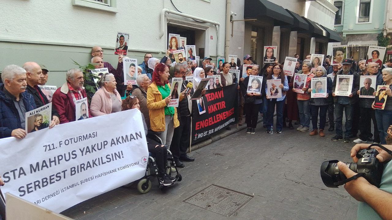 İnsan Hakları Derneği (İHD) İstanbul Şubesi, 711. F oturumunu Beyoğlu'nda bulunan dernek binası önünde gerçekleştirdi. "Tedavi haktır engellenemez" ve "Hasta mahpus Yakup Akman serbest bırakılsın" pankartı açılan eylemde, hasta tutsakların fotoğrafları taşındı.