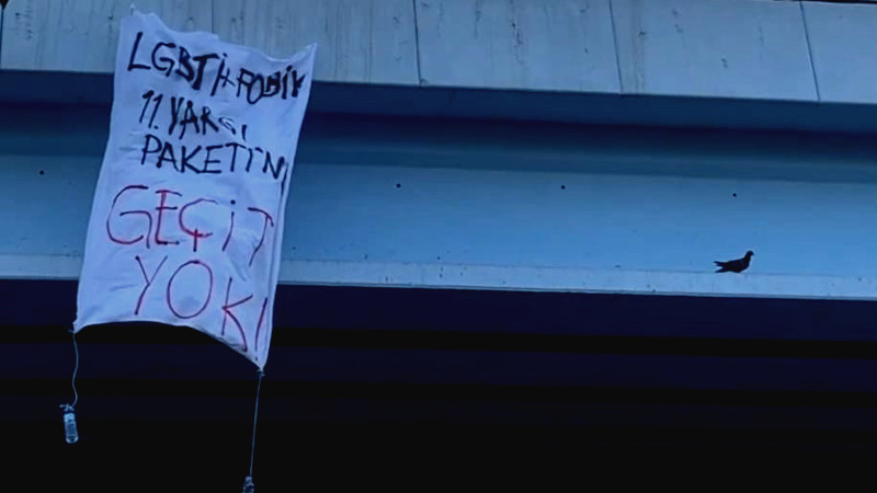 İzmir'de bir üst geçide "LGBTİ+fobik 11. Yargı Paketi'ne geçit yok" pankartı asıldı.