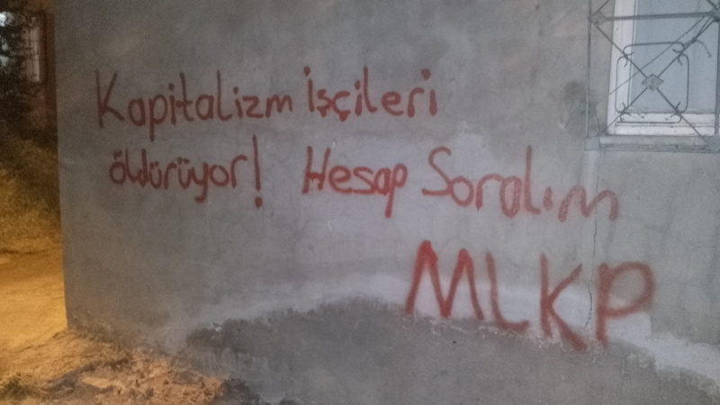 Dilovası, Urfa ve sayısız kentte patronların kar hırsı, iş güvenliği önlemleri almaması sonucu yaşanan iş cinayetlerinde son dönemlerde çok sayıda çocuk işçinin katledildiğini hatırlatan MLKP milisleri, "Kapitalizm işçileri öldürüyor. Hesap soralım" yazılaması yaparak, burjuva düzene karşı mücadele çağrısı yaptı.
