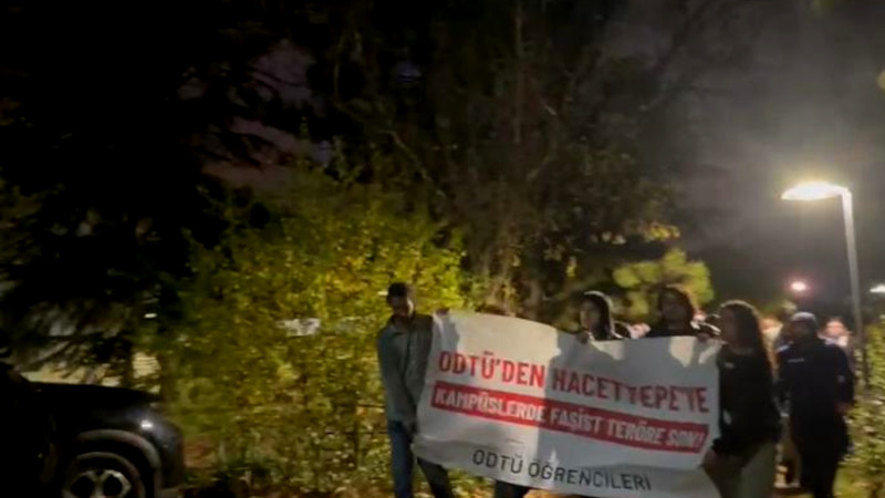 Hacettepe Üniversitesi’nde faşist saldırıya direnenleri selamlayan öğrenciler yurt önünden "ODTÜ’den Hacettepe’ye kampüslerde faşist teröre son" pankartıyla yürüyüşe geçti.