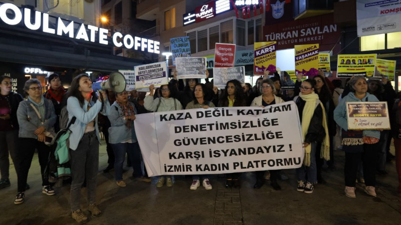 İzmir'de kadınlar, Dilovası'nda 3'ü çocuk 6 kadın işçinin katledilmesine ilişkin eylem yaptı. Yaşananın katliam olduğunu vurgulayan kadınlar, denetimsizlik, güvencesizlik ve kadın emeğinin sömürüsüne karşı ortak mücadele çağrısı yaptı.