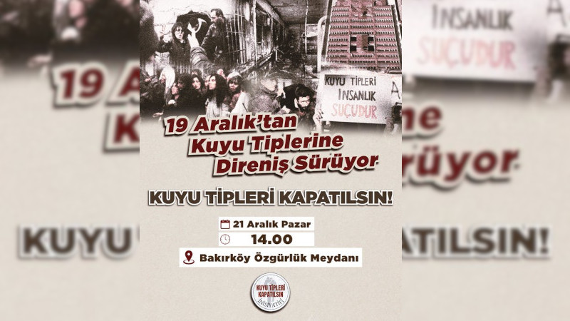 Kuyu Tipleri Kapatılsın İnisiyatifi, "19 Aralık'tan kuyu tiplerine: Direniş sürüyor" şiarıyla 21 Aralık Pazar günü Bakırköy Özgürlük Meydanında bir buluşma gerçekleştirecek. Tecrit politikalarının son bulması ve kuyu tiplerinin kapatılması sloganını yükseltmek için Kuyu Tipleri Kapatılsın inisiyatifi 14.00'de Bakırköy'de yan yana gelmeye çağırıyor.
