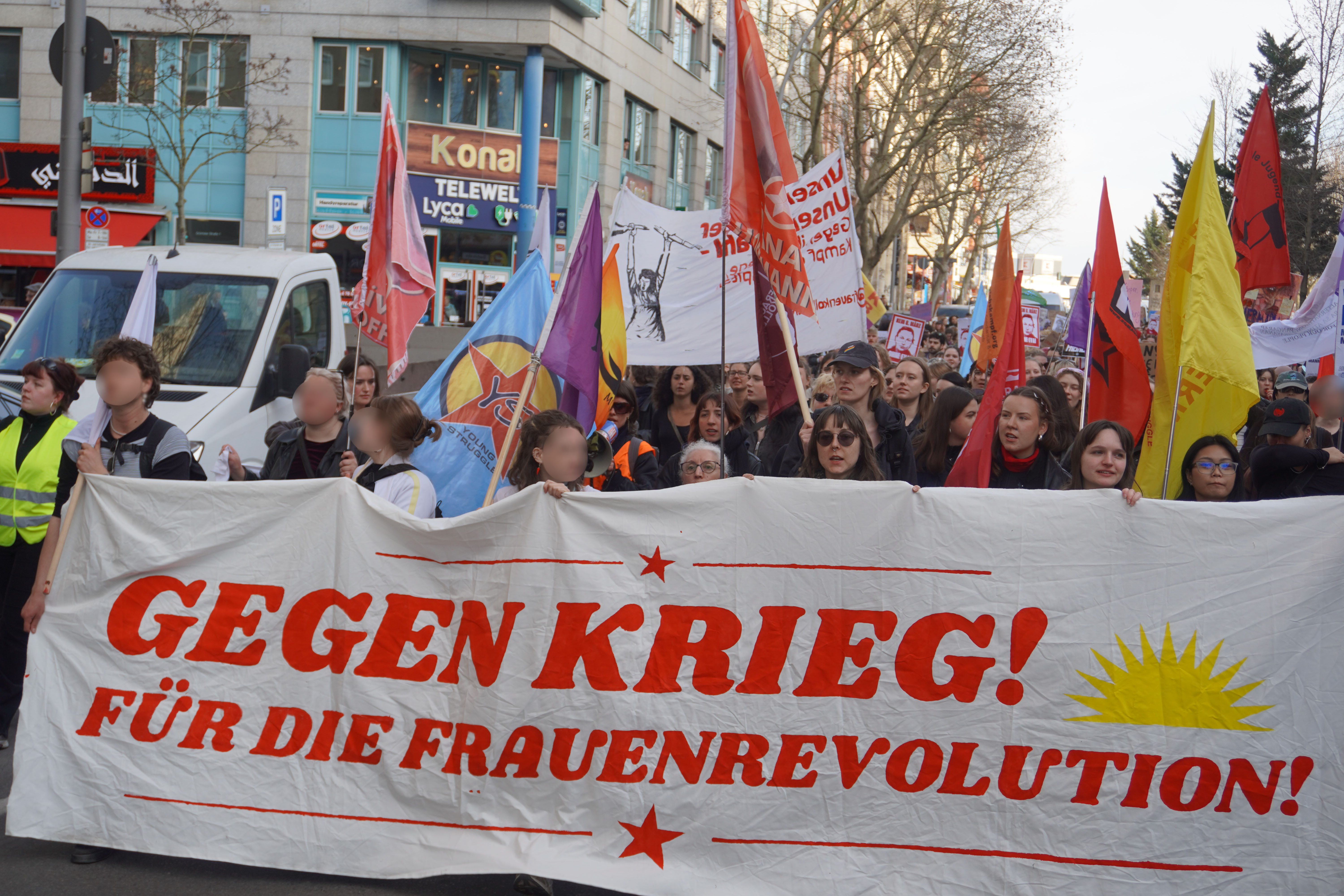 Rojava için pankartlar taşındı, YPJ bayrakları dalgalandı. Ölümsüz kadınların fotoğfları kortejlerde kadınların ellerinde yükselirken, sık sık "Jin, Jiyan, Azadi" sloganı Berlin sokaklarında yankılandı.