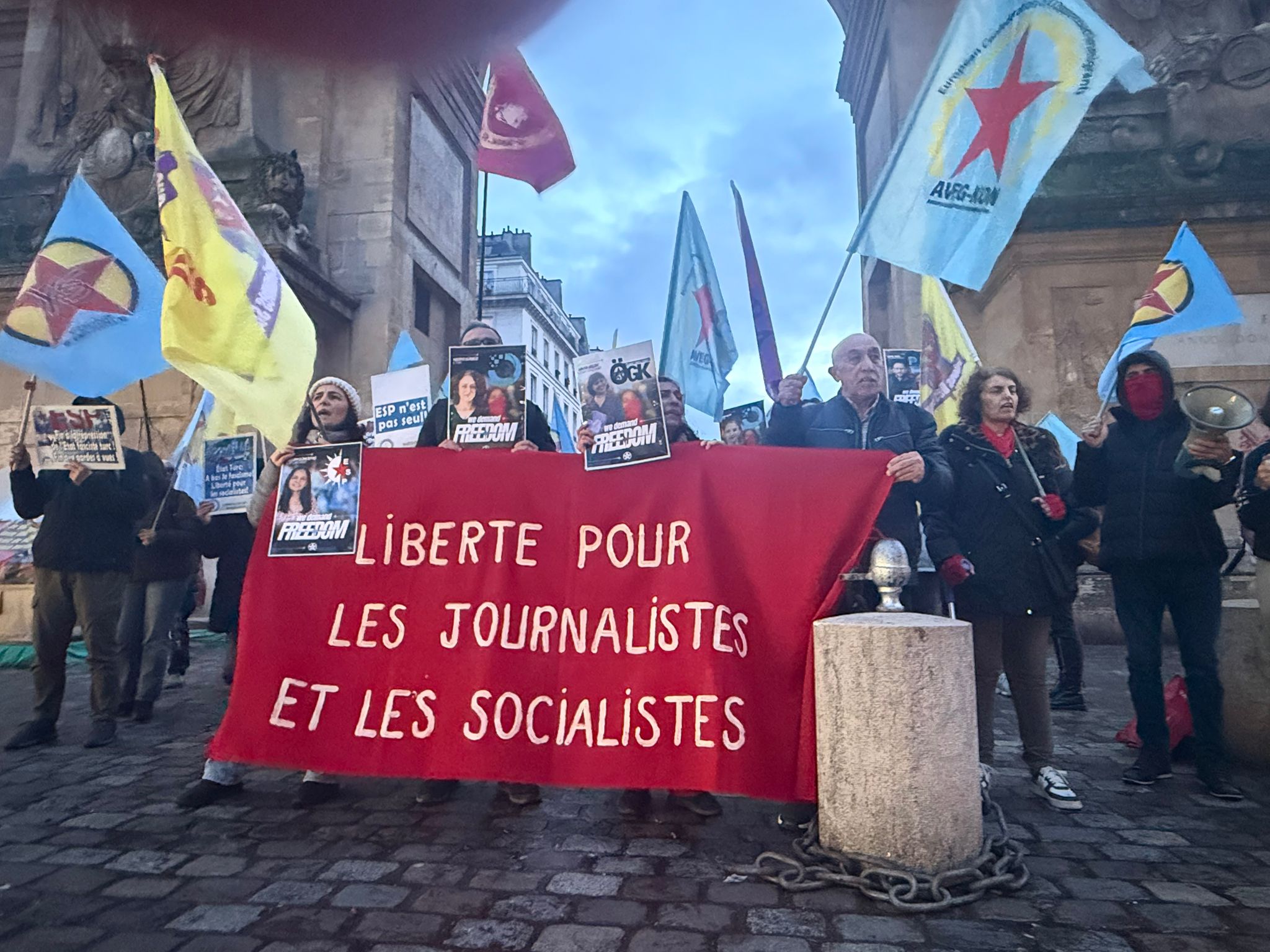 Fransa'nın başkenti Paris'te Strasbourg Saint-Denis Kemer önünde yapılan eylemle Türkiye'deki sosyalistlere yönelik gözaltı saldırısı protesto edildi. ACTİT ve Young Struggle çağrısıyla yapılan eyleme CDK-E, BİR- KAR, ADHK E, BİR temsilcileri de katıldı.