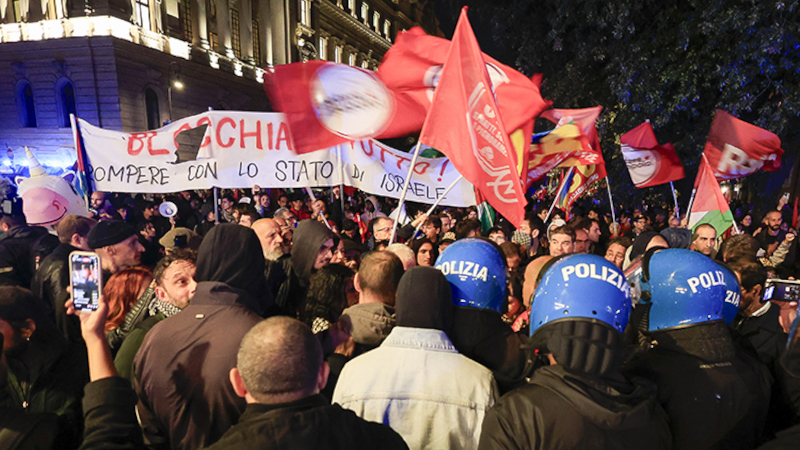 Kalabalık grup, Roma Film Festivali'nin yapıldığı yere yürümek ve bu sırada İsrail'in Roma Büyükelçiliği'nin yakınından geçmek isteyince polis tarafından engellendi. Polis eylemcilere copla ve tazyikli suyla saldırdı.